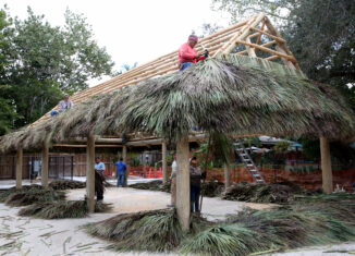 Jimmy Wayne Holdiness builds huge chickee at Bonita Springs attraction Community News Top News Top Story by Beverly Bidney - January 16, 2026January 16, 2026 Workers attach thatch to the roof of the newly constructed chickee at Wonder Gardens in Bonita Springs on Dec. 22, 2025. (Photo by Beverly Bidney) BONITA SPRINGS — Chickee builder Jimmy Wayne Holdiness and his crew built a 40 foot by 20 foot chickee at the Wonder Gardens attraction in Bonita
